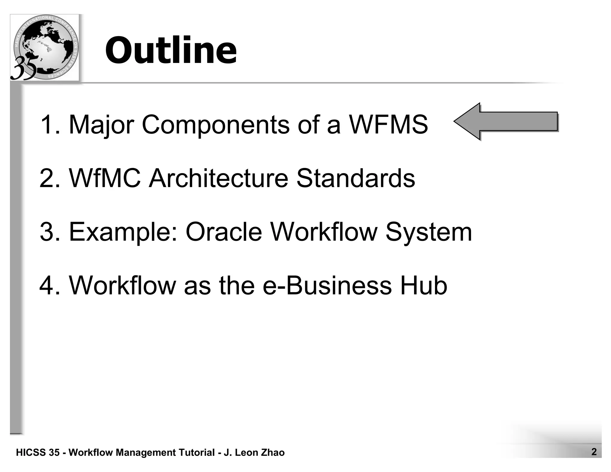 This document discusses workflow management systems and provides an example of the Oracle workflow system. It describes the major components of a workflow management system including the process model, workflow engine, and applications/database. It also outlines the Workflow Management Coalition architecture standards and discusses how workflow can be used as an e-business integration and process management tool.