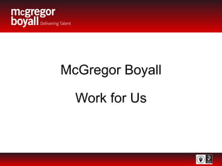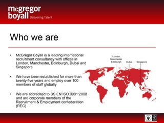 McGregor Boyall is a leading international recruitment consultancy with offices in London, Manchester, Edinburgh, Dubai and Singapore that has been established for over 25 years. They specialize in recruiting for commerce and industry, financial services, legal, IT and telecoms, and life sciences in the UK, Europe, Middle East, and Asia Pacific regions. McGregor Boyall values quality, integrity, collaboration and expertise and offers career development opportunities through training, tailored development plans, and annual performance reviews.