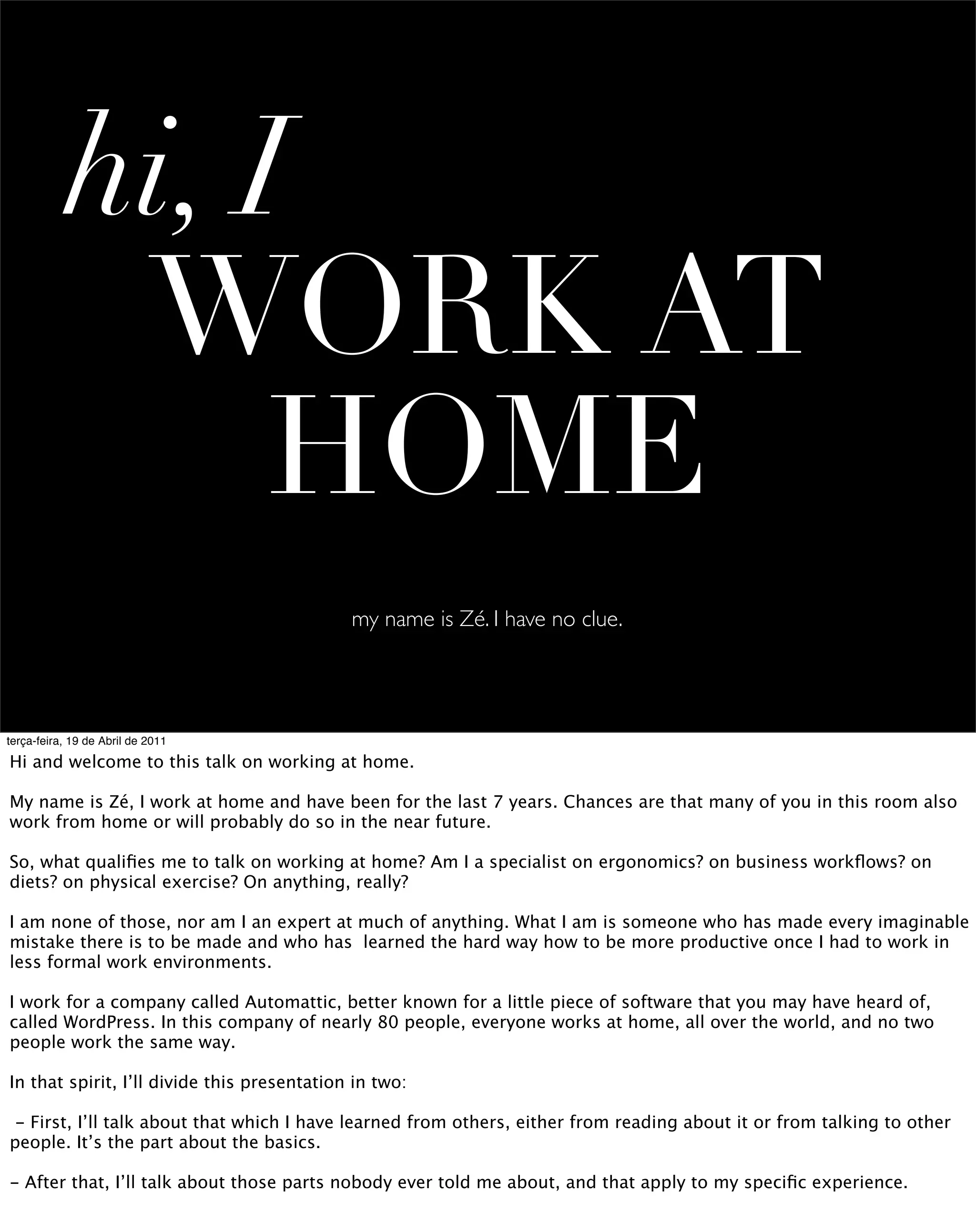 Zé works from home and gives a talk sharing lessons learned over 7 years of working remotely. Some key points from working at home include defining a dedicated workspace, investing in quality equipment, establishing a routine including breaks, eating lunch away from home, and focusing on the present rather than overly planning the future. Zé also discusses avoiding unnecessary "work accessories" and focusing only on the essentials for productive work.