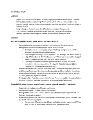 This document summarizes the applicant's work history, highlighting their experience leading teams across various business process outsourcing accounts, including customer service, technical support, banking, and human resources. They have played vital roles in pioneering new accounts and managing operations from project start-up through transitioning to steady state. The applicant has in-depth experience in client relations, account management, quality assurance, forecasting, scheduling, policy formulation, and people management.
