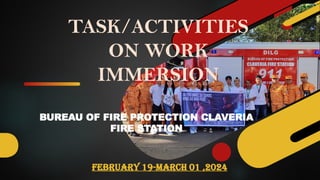 The document outlines a work immersion program held at the Claveria Fire Station, detailing activities and lessons over 10 days, focusing on skill development in firefighting, emergency response, and teamwork. Participants engaged in practical training, including fire safety, bandaging techniques, and knot tying, enhancing both their professional skills and personal growth. The experience emphasized the importance of dedication, ethics, and service to the community, advocating for the value of such programs in educational settings.