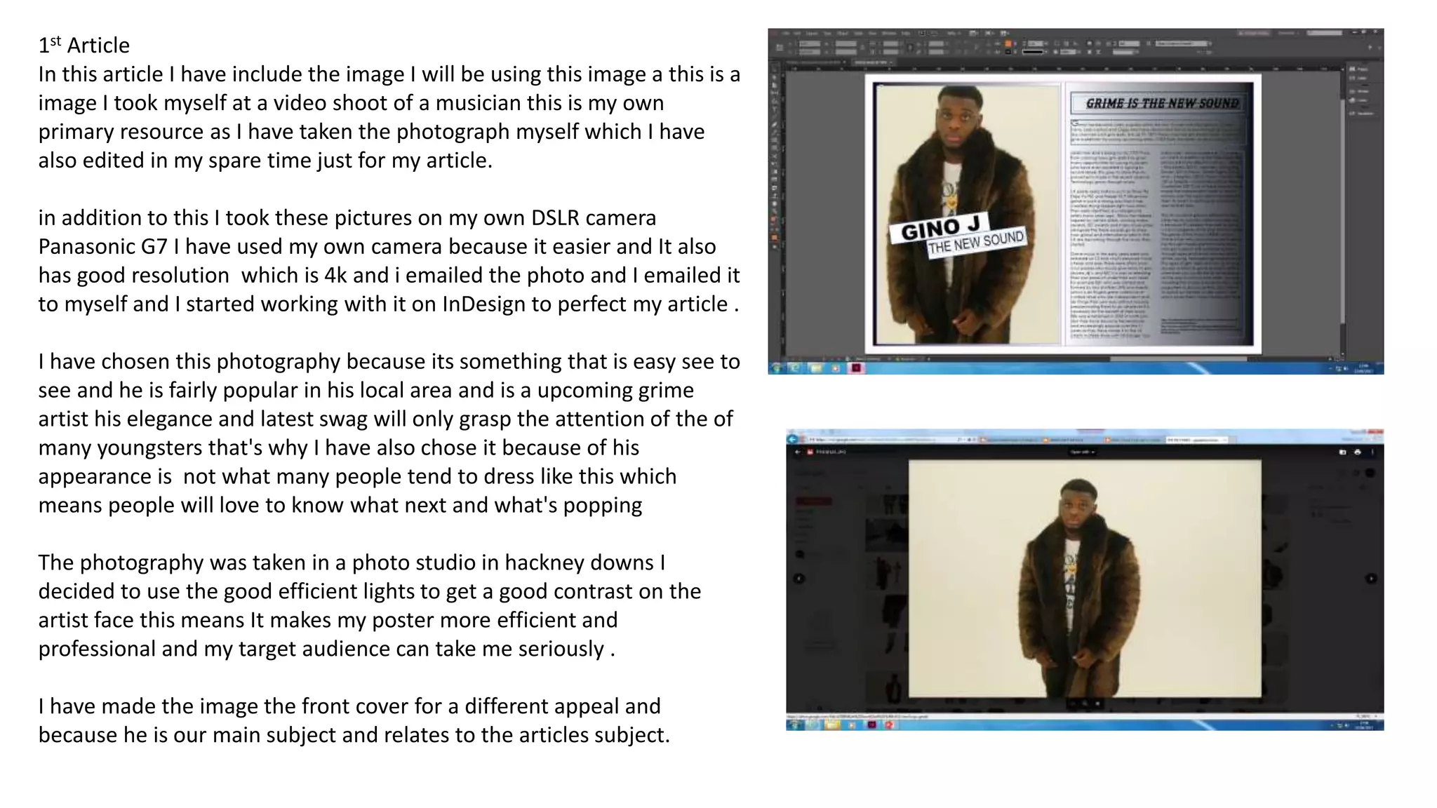 This document provides information about the development of an interactive article for Snapchat about an up-and-coming grime artist. The article includes a clear primary image of the artist that was taken by the author to attract readers. When swiped up, readers can learn more about grime music and vote on their favorite rappers. Linking to an exclusive behind-the-scenes video at the end aims to boost engagement with the article and give readers something to discuss. The author chose to use Word over InDesign due to missing a deadline and lack of computer access.