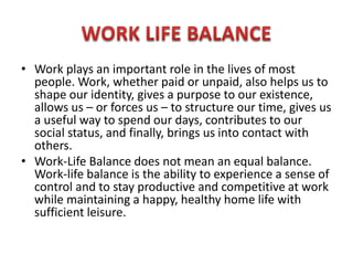 Work plays an important role in shaping identity and providing purpose, but achieving a balance between work and personal life is important. Work-life balance is the ability to be productive at work while maintaining a happy home life and leisure activities. It involves balancing time between work responsibilities and other aspects of life like family, personal interests, and leisure. Maintaining self-management, time management, stress management, change management, technology management, and leisure management can help achieve work-life balance.