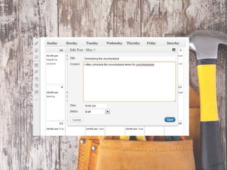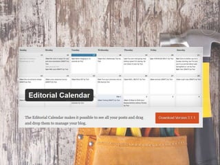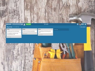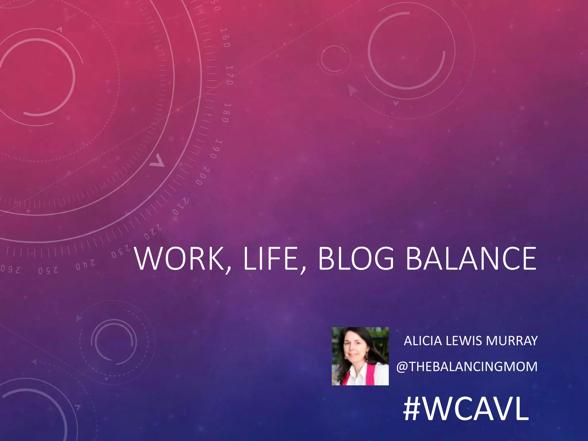 This document provides tips and tools for balancing work, life, and blogging. It recommends focusing on high-yield activities and energy management over time management. Specific tips include only working on important tasks, unplugging from work to relax, utilizing reflection, and giving yourself grace. Tools mentioned are Evernote, OneNote, Editorial Calendar, Trello, and Focus Booster. The document concludes by listing action steps like defining core values, prioritizing priorities, showing up every day, outsourcing tasks, and never giving up.