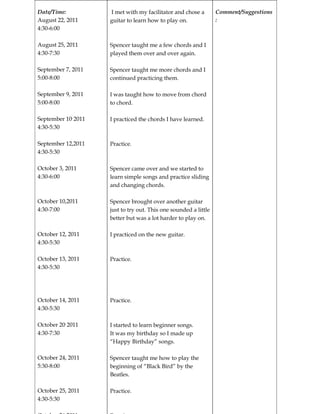 Maidie Knight took acoustic guitar lessons between August 2011 and October 2011. She met with her instructor Spencer who taught her different chords and how to transition between them. Over the course of her lessons, Maidie practiced the chords she learned and began playing some simple songs, including a version of "Happy Birthday" for her birthday.
