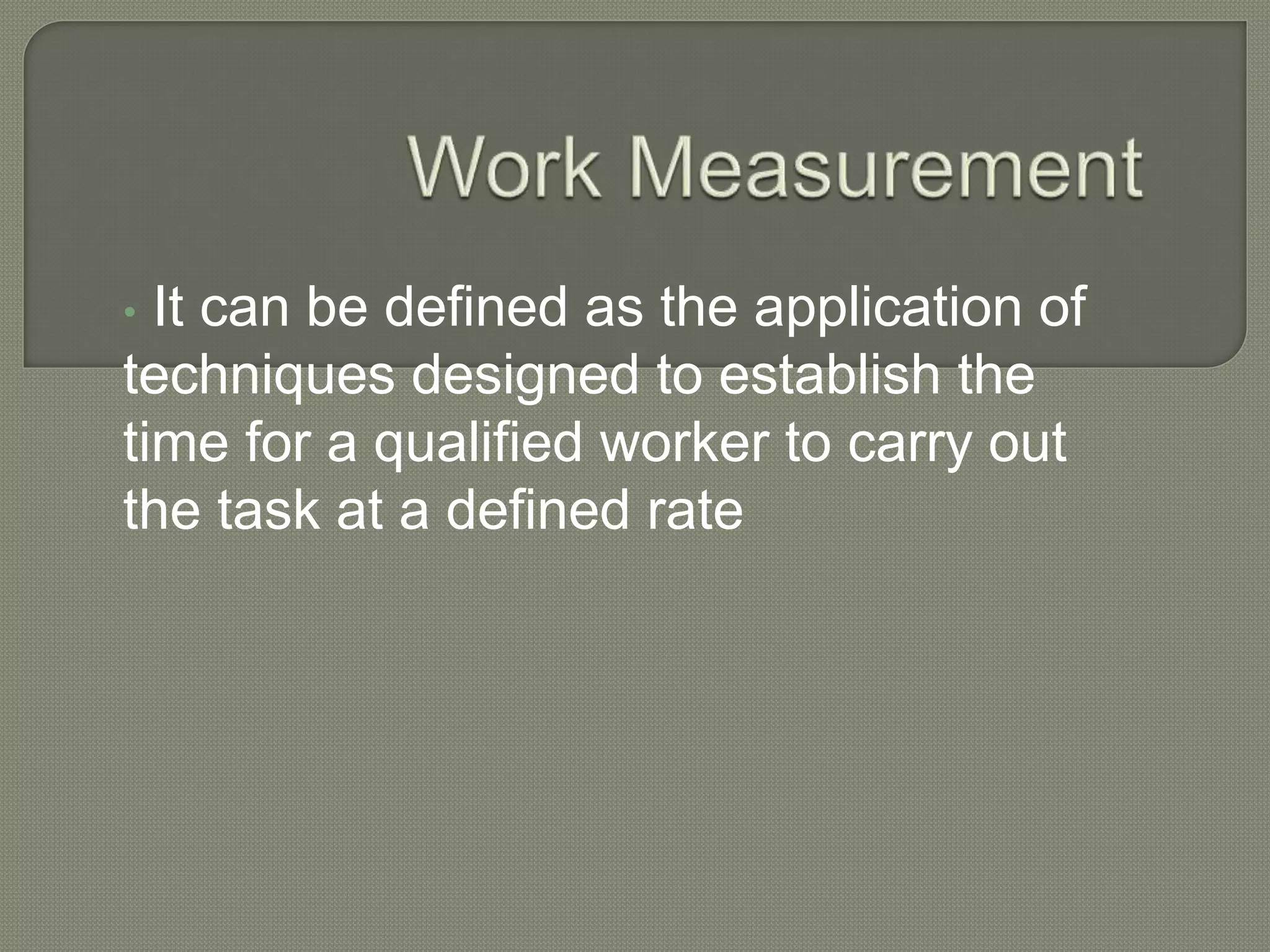 Work study involves establishing the standard time required for workers to complete tasks through time and motion studies. It is used for production planning and control, setting performance standards, and estimating costs. A time study engineer times workers performing jobs using a stopwatch and applies allowances to account for rest breaks, setup times, and other non-working periods to determine the standard time for each task. The standard times are then used to set worker productivity targets and improve efficiency.