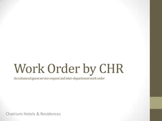This document describes a work order system created by CHR for Chatrium Hotels & Residences to improve guest satisfaction and efficiently manage service requests across departments. The system allows guests and staff to create paperless service tickets, assigns tasks to appropriate teams, and provides tracking and reporting on requests from opening to closure. It will be launched in November 2012 at four Chatrium properties in Bangkok and Yangon to facilitate inter-department communication and coordinate guest services.