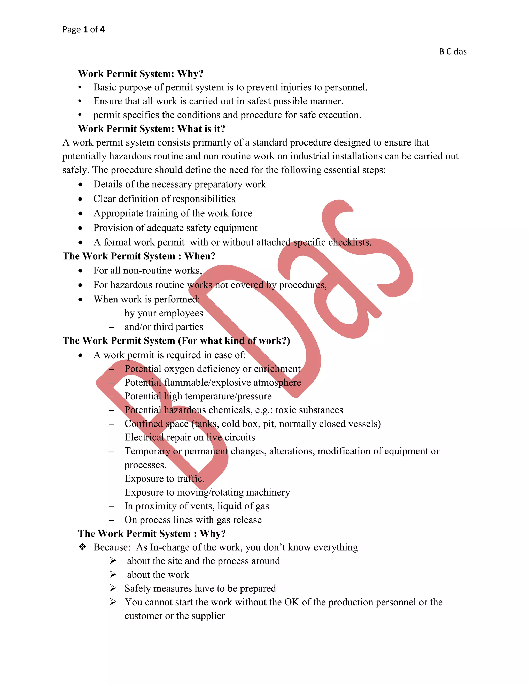 The work permit system is designed to ensure safety during potentially hazardous work by outlining necessary conditions and procedures. It involves preparatory steps, clear responsibilities, and appropriate training, and is required for non-routine or hazardous tasks. Key components include proper work descriptions, risk assessments, and the collaboration of responsible authorities to maintain safety protocols.