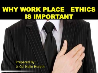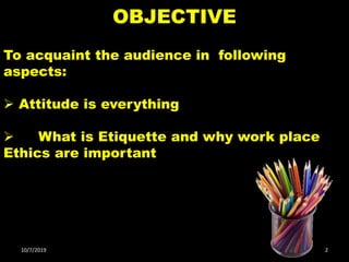 The document discusses the importance of workplace ethics and etiquette. It begins by explaining that attitudes are important and defining etiquette. It then discusses concepts like the "iceberg model" which notes that most of what shapes a person is unseen below the surface. The document outlines characteristics of good work ethics like attendance, character, teamwork, communication skills, and respect. It emphasizes developing a positive attitude and treating others well. Overall, the document stresses that developing strong ethics, etiquette, and interpersonal skills are important for professional success and creating a positive work environment.