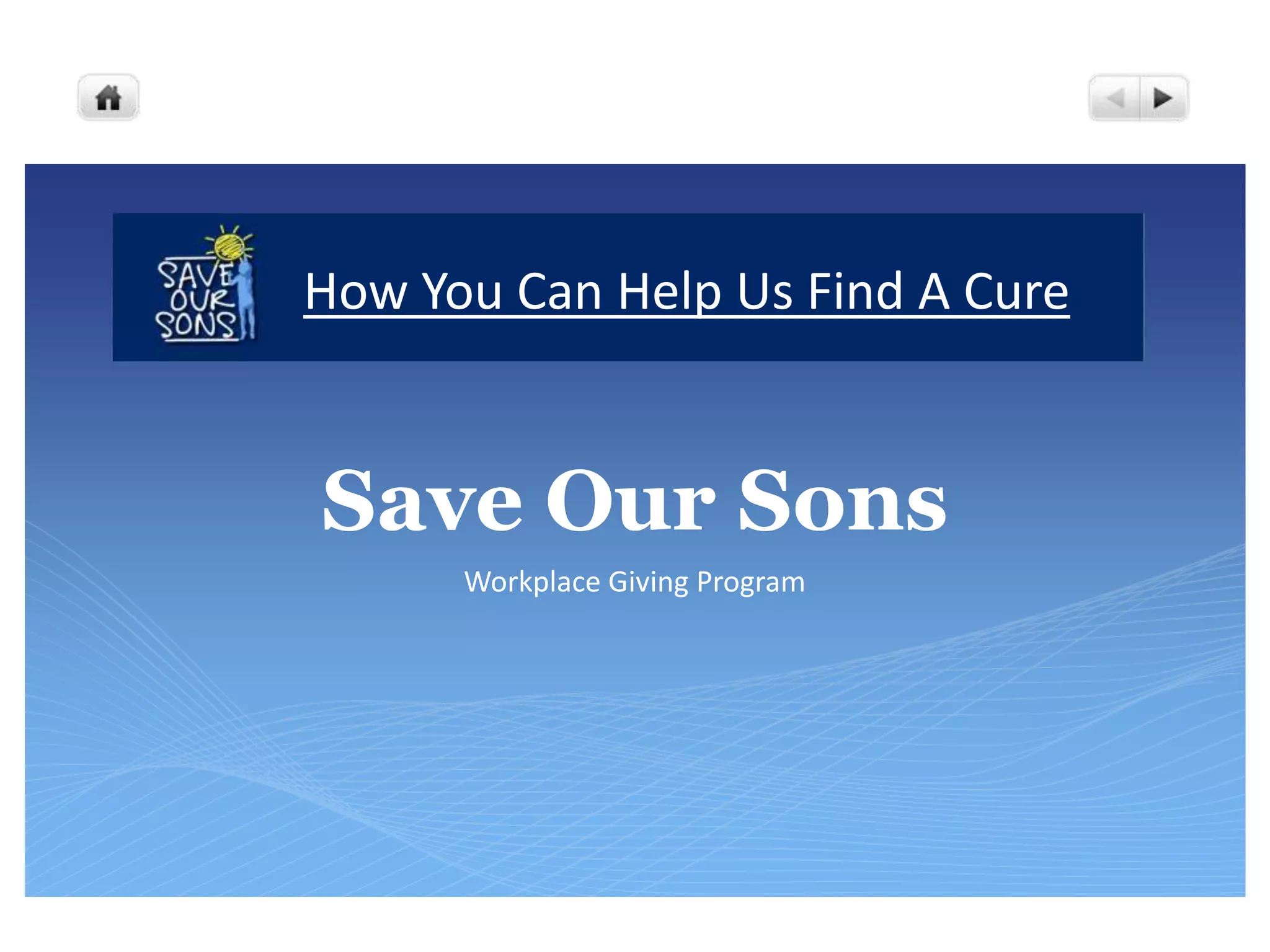 This document provides information about Duchenne Muscular Dystrophy (DMD) and Save Our Sons' workplace giving program to find a cure. DMD is a degenerative muscle disease that affects mostly boys and has a 100% mortality rate. Save Our Sons was started in 2008 to fund research for a cure. Their goals are to fund clinical trials, help families affected by DMD, and raise awareness. The workplace giving program allows small regular donations through payroll deductions, which can make a big difference when combined. It provides donors recognition and information on how funds are used.