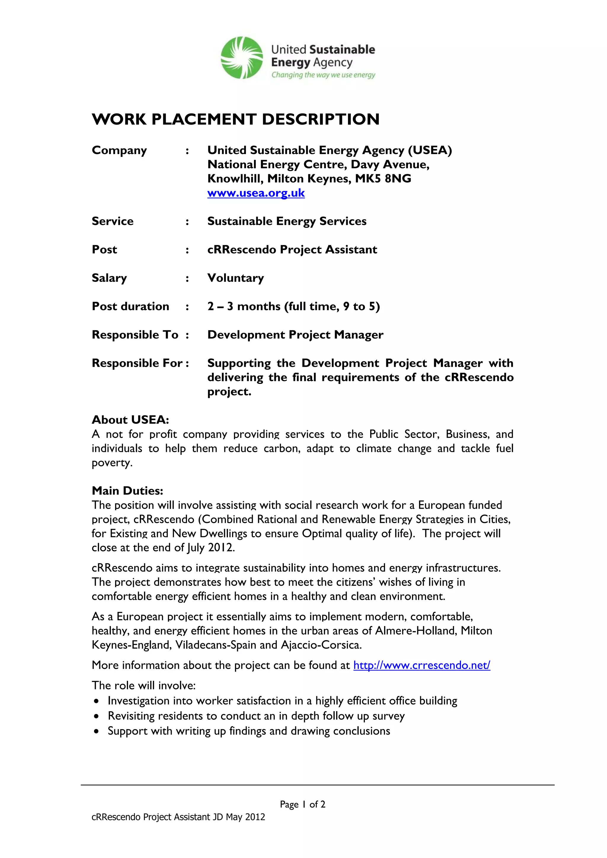 This voluntary position is for a Project Assistant at the United Sustainable Energy Agency to help complete the cRRescendo project by the end of July 2012. The assistant will conduct social research like investigating worker satisfaction in an efficient office building, revisiting residents to conduct follow-up surveys, and assisting with writing up findings. The preferred candidate will have interest and knowledge of sustainable energy and European projects, as well as skills in data analysis and Microsoft Office applications.