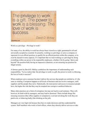 The document discusses how work should be viewed as a privilege rather than a right. It argues that in order to hold a job, one must prove themselves a responsible and ethical employee who will not abuse their position. The document outlines different types of corruption that can occur in various employment contexts and levels of an organization. It emphasizes that all employees, from frontline workers to managers, have a role to play in upholding ethics and reporting corruption to ensure the privilege of work is not abused. Maintaining strong moral values and ethical conduct is important for individual success and is what distinguishes those who understand work is a privilege, not a right.