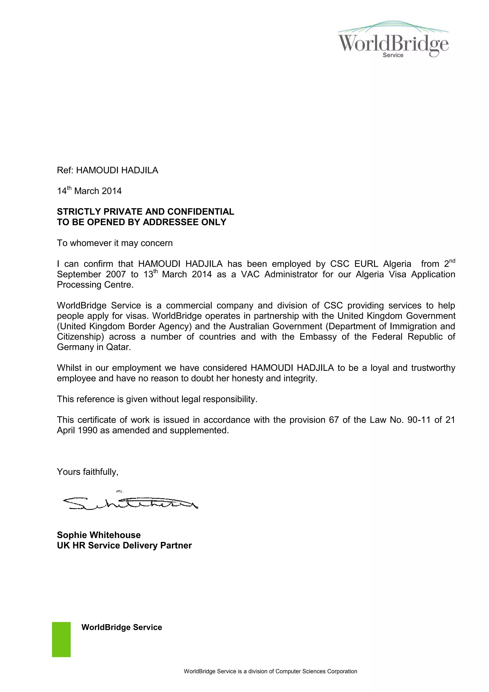 WorldBridge Service is a division of Computer Sciences Corporation that provides visa application processing services for governments. The document confirms that Hamoudi Hadjila worked as a VAC Administrator for WorldBridge's Algeria Visa Application Processing Centre from September 2007 to March 2014. It states that Hamoudi Hadjila was considered a loyal, trustworthy employee during her time at WorldBridge, and the reference is provided without any legal responsibility.