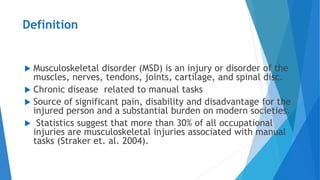 This document discusses work-related musculoskeletal disorders (WMSDs) of the elbow. It defines WMSDs as injuries or disorders of the muscles, tendons, and joints caused by repetitive strain from manual labor tasks. Common WMSDs of the elbow mentioned include lateral epicondylitis (tennis elbow), medial epicondylitis (golfer's elbow), cubital tunnel syndrome, bursitis, tendinitis of the distal bicep and triceps, and pronator teres syndrome. Risk factors include excessive force, awkward postures, repetition, direct pressure, vibration, and non-occupational factors like fitness level. Symptoms may include pain, numbness, swelling, and loss of flexibility