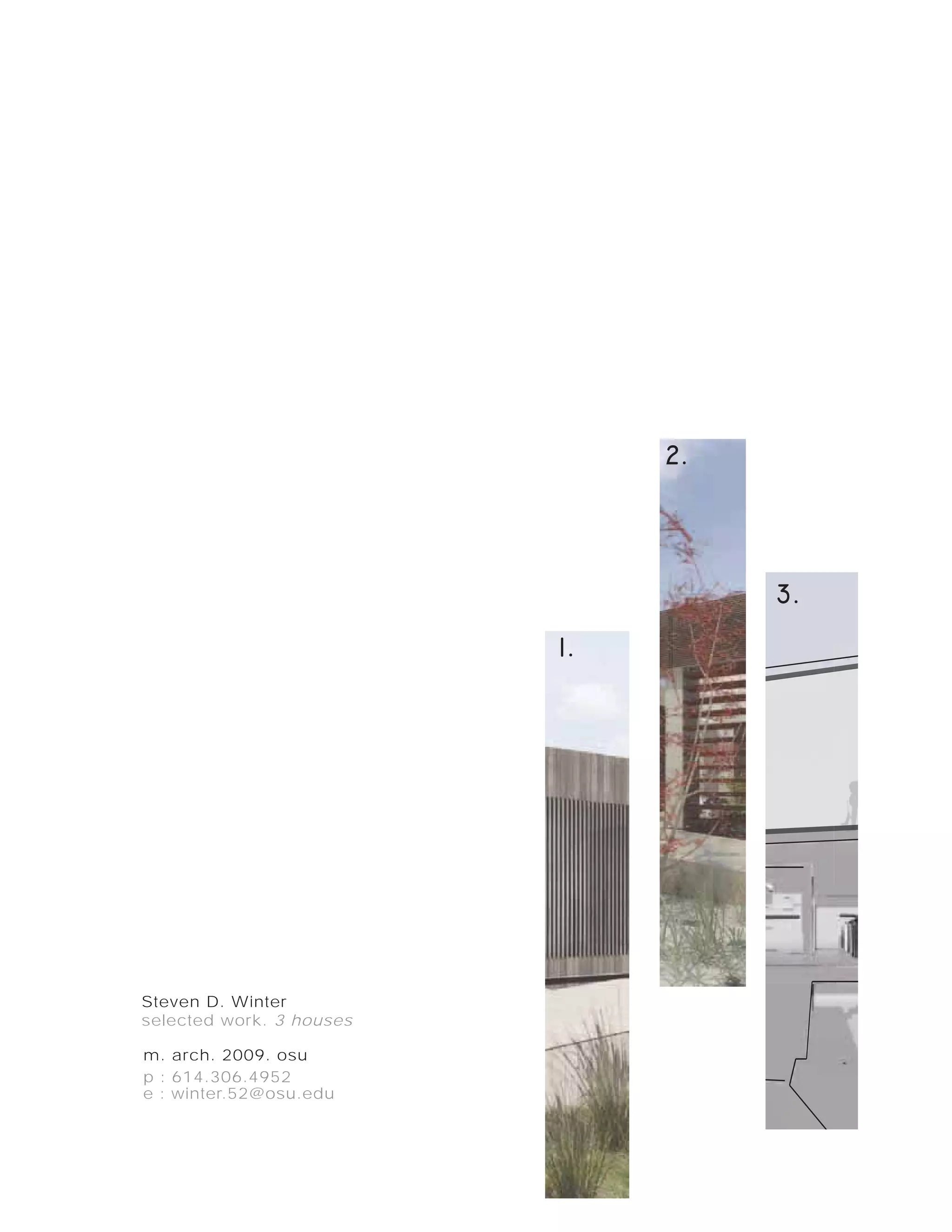 Steven Winter is an architect who graduated from Ohio State University with a Master's in Architecture in 2009. He has worked on three house projects: the 2009 OSU Solar Decathlon House, the 2010 Solar Decathlon Design Competition house, and a 2007 studio project house. The 2009 house emphasized centralized living and an interior/exterior interface that could adapt the space. It placed 8th in architecture at the competition. The 2010 house was designed for a post-industrial city and featured a ventilated facade and photovoltaics. The 2007 studio project house used physical, phenomenological, and photographic projections in its design.