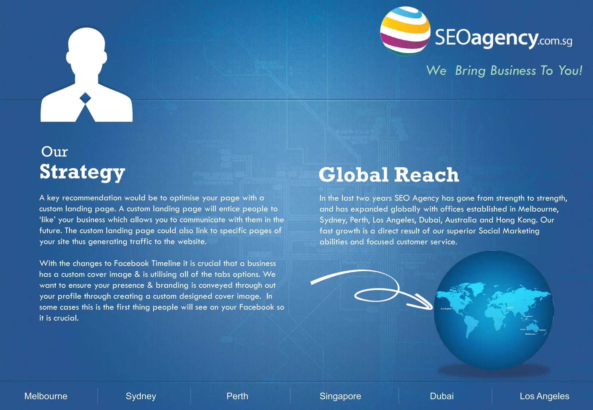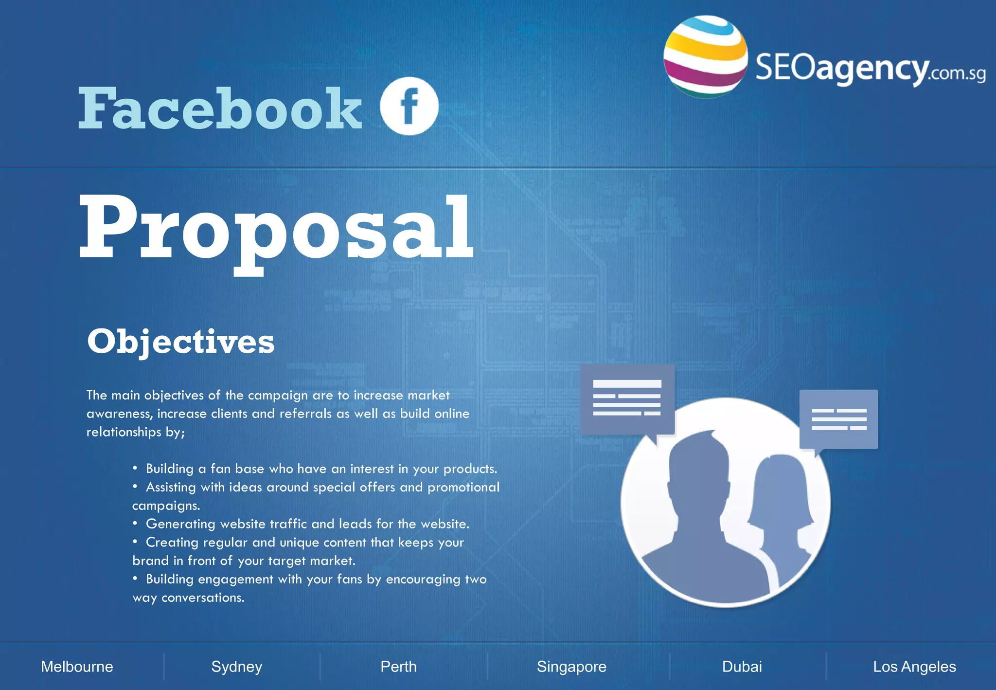 The proposal outlines objectives for a Facebook marketing campaign including building a fan base, generating website traffic, and creating regular content. It recommends optimizing the page with a custom landing page and cover image. Over a 6-12 month period, the strategy will implement tactics like posts, news, and engagement activities to encourage interactions and brand advocates. Facebook advertising will be used to target the business's market through geographic and demographic targeting.