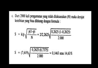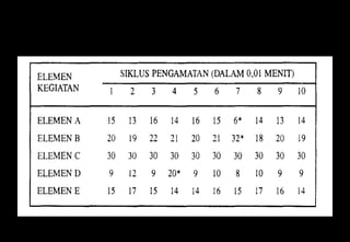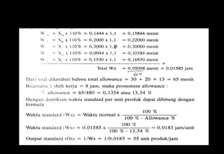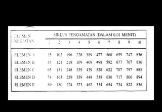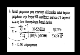 1. Studi sampling pekerjaan dilakukan selama 10 hari untuk mengukur aktivitas kerja dan tidak kerja operator dengan mengambil sampel 50 kali setiap harinya dan menghitung proporsi masing-masing aktivitas.