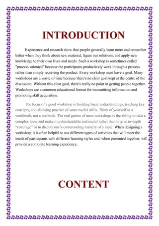 The document provides guidance on conducting effective workshops. It discusses workshop objectives, planning, activities, facilitation tips, and evaluation. Workshops are intended to actively engage participants in learning new information or skills through reflection, discussion, practice and planning for real-world application. Effective workshops involve clearly defining objectives, considering participant needs, facilitating interaction, and gathering feedback to improve future sessions.