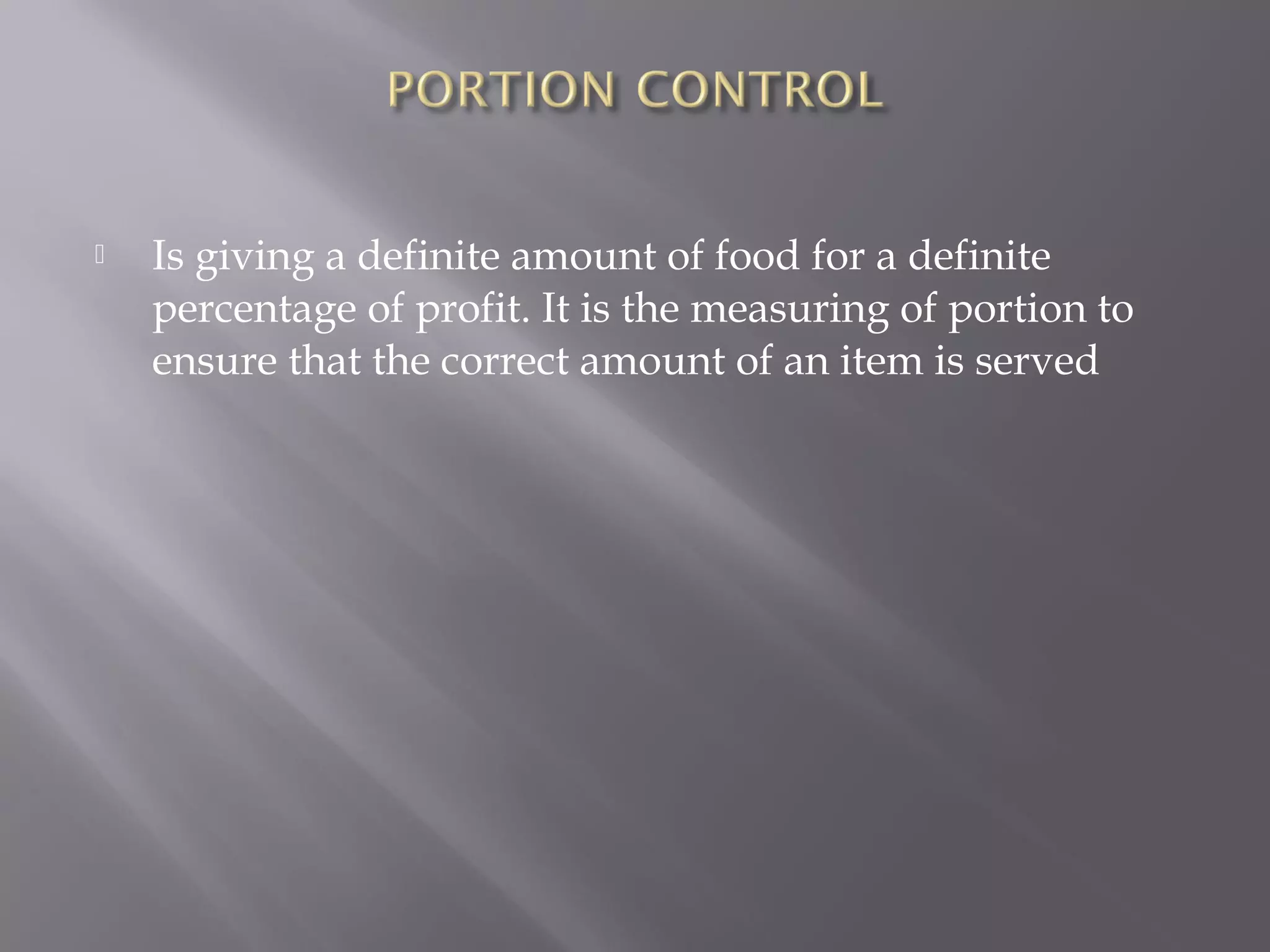 This document provides guidelines for proper management, food preparation, and portion control in a food service operation. It discusses establishing standard recipes, menus, and procedures for tasks like purchasing, food preparation, and plating/serving food. Portion control is emphasized as important for estimating food costs, reducing waste, standardizing yields, and setting prices. Proper tools like scales, scoops, and markers should be used to consistently portion accurate sizes attractively on plates for customers.