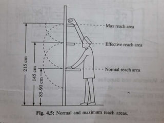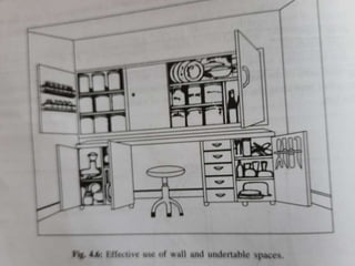 Work simplification involves optimizing five aspects of work: the work area, worker's area of reach, work space, equipment/materials/supplies, and worker movements. The work area should have the proper height and layout to allow standing work without bending. The area of reach is the space a worker can access without fully extending their arms. Sufficient work space is needed to complete tasks efficiently. Equipment should be conveniently located on shelves within reach zones. Conscious movements can reduce energy expenditure. Kitchen design also considers location, drainage, electricity, ventilation, lighting, work surfaces, and layout to facilitate workflow and a comfortable work environment.