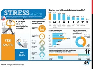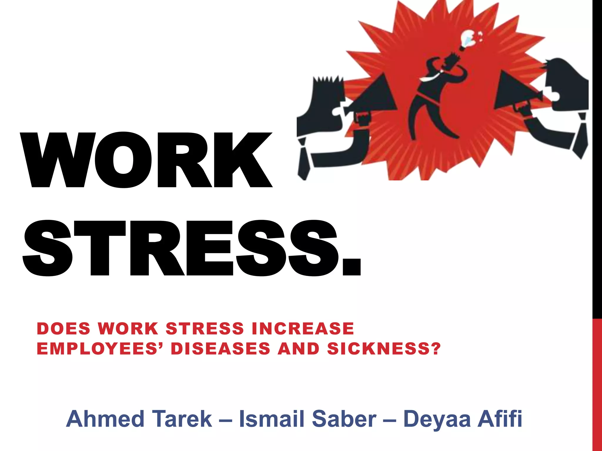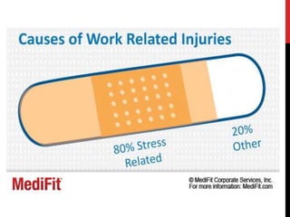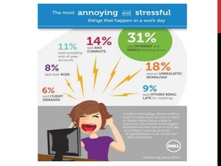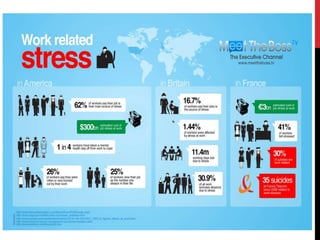 Work stress, defined as occupational stress, can negatively affect mental and physical well-being, potentially leading to illness if excessive and prolonged. The document outlines various causes of work stress, including workload, time pressures, and inadequate authority, while highlighting symptoms such as weight gain and sleep problems. Research indicates that a significant percentage of workers report high levels of stress, affirming that work-related stress increases employee sickness.