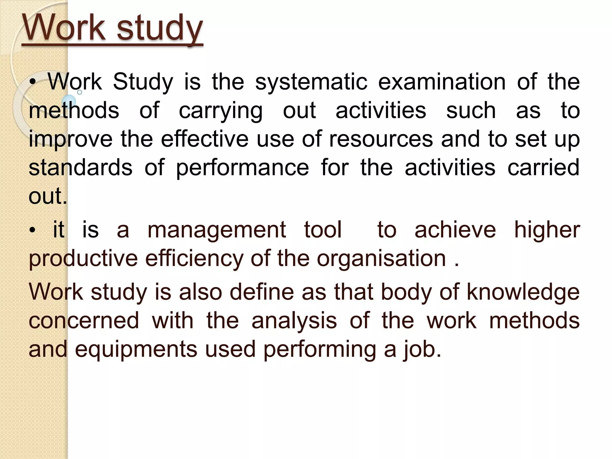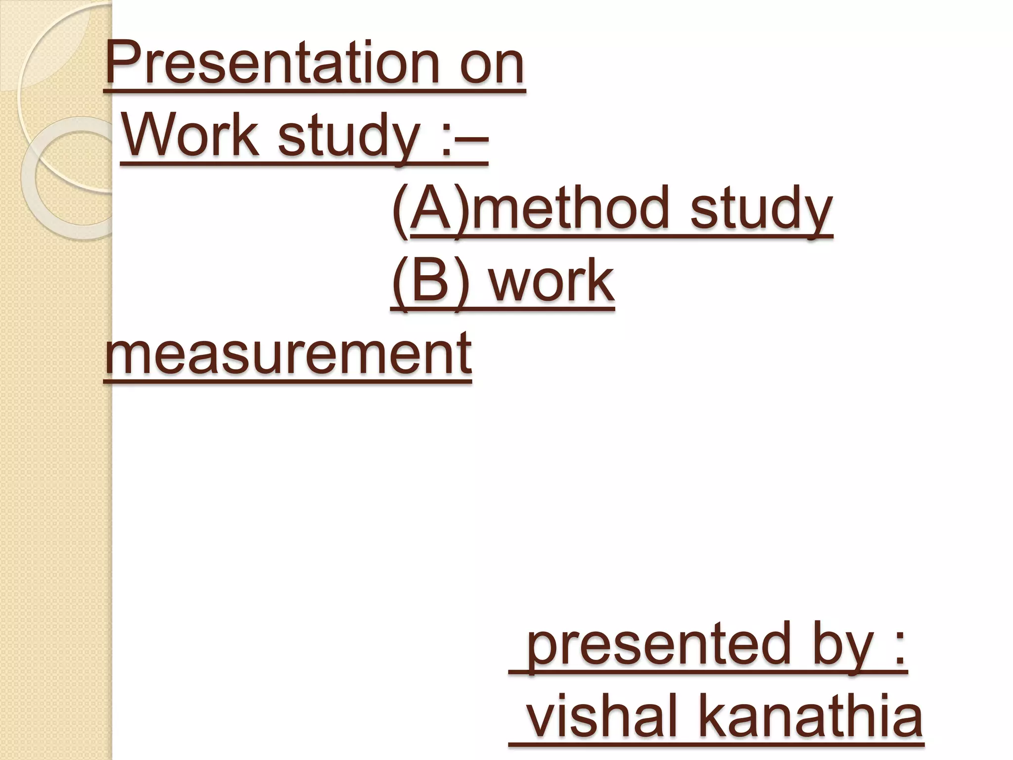 This presentation discusses work study and its two main methods: method study and work measurement. Work study aims to improve productivity and efficiency through analyzing work methods. Method study examines work processes to simplify and standardize methods, reducing waste. The key steps of method study are select, record, examine, develop, install, and maintain a work process. Work measurement establishes standard time durations for jobs based on a qualified worker's performance to set production targets and incentives. The goals are to eliminate ineffective time and set achievable performance standards.
