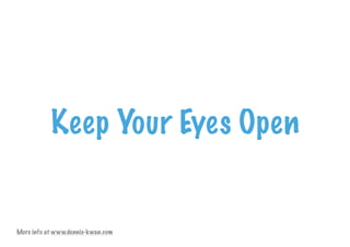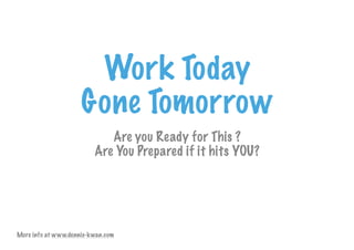 The document discusses preparing for potential job loss and provides tips on finding new opportunities. It advises people to keep their eyes open for changes in their industry, learn new skills through courses, network to broaden knowledge and find new contacts, update outdated resumes, and start planning for career changes today. More information can be found at the website www.dennis-kwan.com.