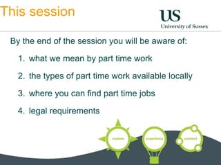 This document provides information about part-time work opportunities for students at the University of Sussex. It discusses the types of part-time jobs available locally in Brighton & Hove such as retail, food service, and administrative work. The document also provides details on the maximum hours students can work, benefits of part-time employment, and resources for finding jobs including the university's online job database and career center. Students can explore approximately 15-20 hours per week of part-time employment under UK visa restrictions.