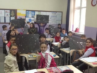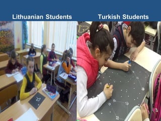Students from Lithuania and Turkey collaborated on a Comenius project where they created their own constellations by arranging star stickers on black paper to form pictures and writing accompanying myths. They presented their stories to their class, and the teacher selected three for translation into English so the students could work together in pairs or individually.