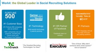 The document summarizes Work4's social recruiting solutions for posting jobs and promoting employer brands on social media platforms like Facebook. It highlights that Work4 is a global leader in social recruiting technologies, with over 500 customers including Fortune 500 companies. The document also outlines key trends driving the growth of social recruiting, Work4's flagship Social Job Posting and Facebook Career App solutions, and case studies of companies that achieved success in hiring using Work4's technologies.