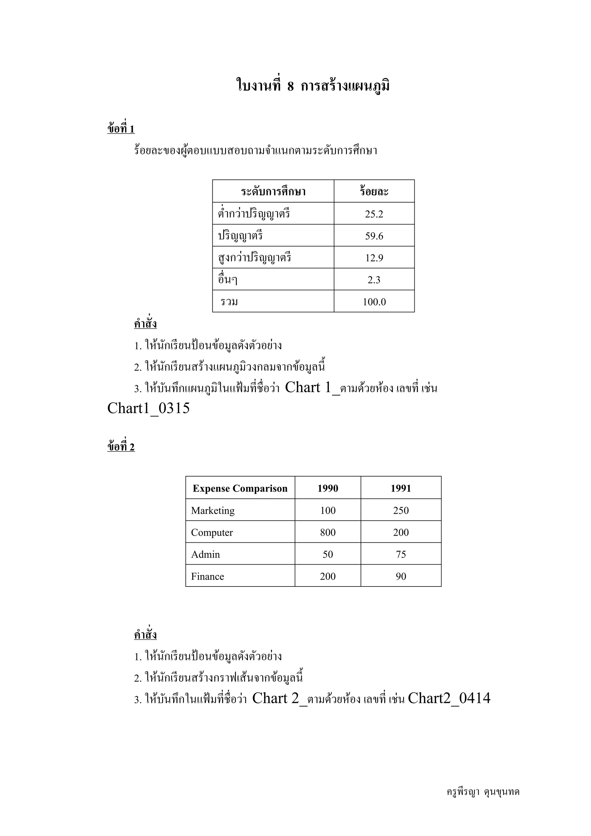 างแผนภูมิ ข้ อที 1 ร้อยละของผูตอบแบบสอบถามจําแนกตามระดับการศึกษา ้ ระดับการศึกษา ร้ อยละ ตํากว่าปริ ญญาตรี 25.2 ปริ ญญาตรี 59.6 สู งกว่าปริ ญญาตรี 12.9 อืนๆ 2.3 รวม 100.0 คําสั ง 1. ให้นกเรี ยนป้ อนข้อมูลดังตัวอย่าง ั 2. ให้นกเรี ยนสร้างแผนภูมิวงกลมจากข้อมูลนี ั 3. ให้บนทึกแผนภูมิในแฟ้ มทีชือว่า Chart 1_ตามด้วยห้อง เลขที เช่น ั Chart1_0315 ข้ อที 2 Expense Comparison 1990 1991 Marketing 100 250 Computer 800 200 Admin 50 75 Finance 200 90 คําสั ง 1. ให้นกเรี ยนป้ อนข้อมูลดังตัวอย่าง ั 2. ให้นกเรี ยนสร้างกราฟเส้นจากข้อมูลนี ั 3. ให้บนทึกในแฟ้ มทีชือว่า Chart 2_ตามด้วยห้อง เลขที เช่น Chart2_0414 ั ครู พีรญา ดุนขุนทด