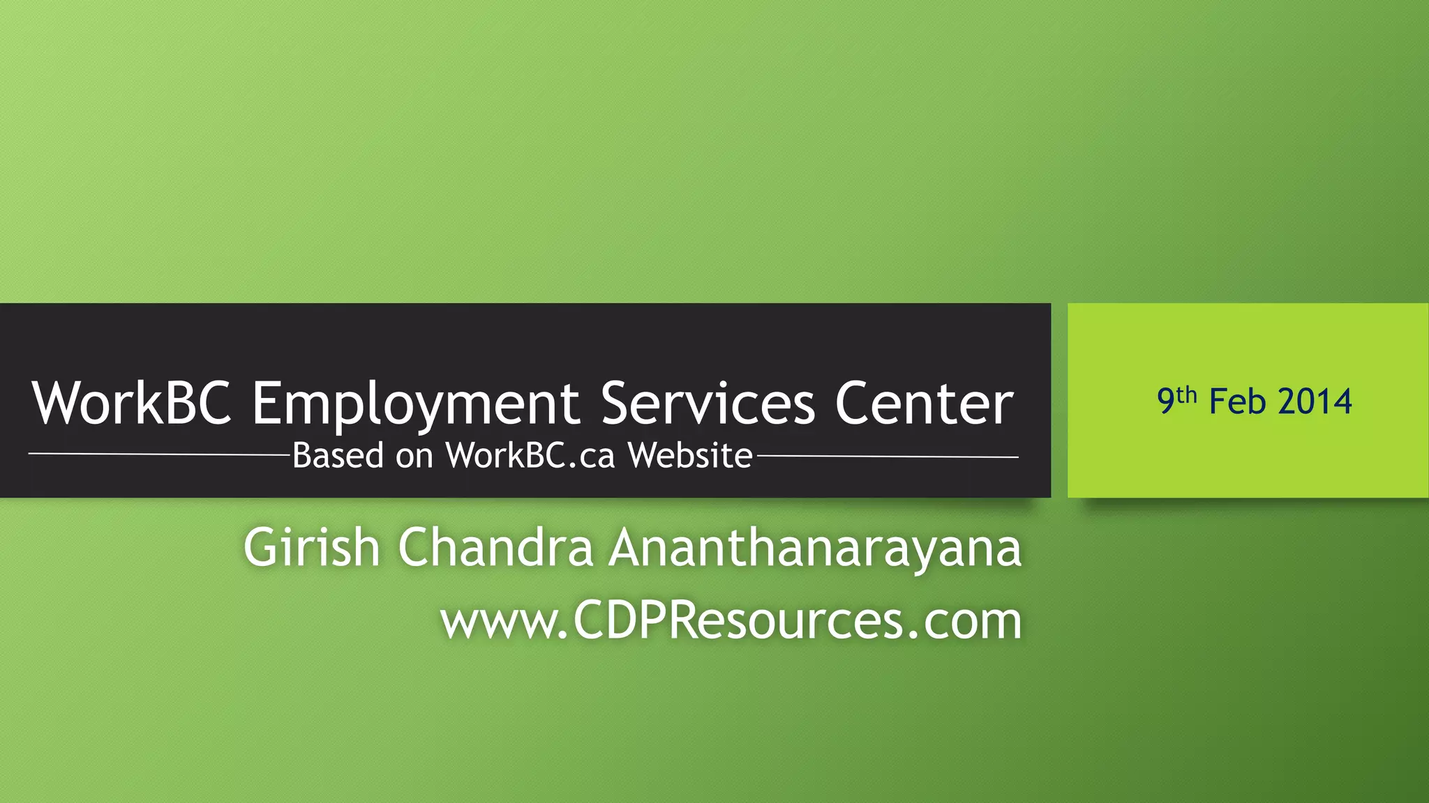 The document provides an overview of WorkBC employment services in British Columbia. It describes the history and goals of WorkBC and the Employment Program of British Columbia (EPBC). It outlines the services offered at WorkBC Employment Services Centers, including self-serve resources, personal employment planning, skills training, work experience placements, and specialized support. Eligibility requirements are explained, as are the general and supplemental services available to eligible clients. Specific programs target support for groups like Aboriginal people, immigrants, older workers, women, youth, and people with disabilities.