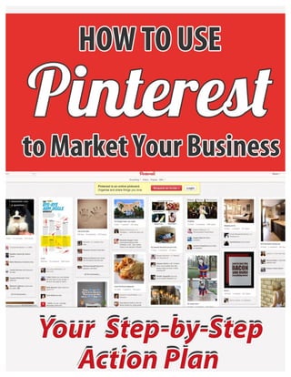 The document provides instructions for using Pinterest to market a business. It explains that Pinterest and photos are favored by Facebook and Google algorithms, allowing content to spread widely and rank highly in search results. It outlines five steps: 1) Understanding Pinterest's power, 2) Setting up a profile, 3) Pinning content, 4) Making it easy for people to connect, and 5) What not to do, such as overt self-promotion. The goal is to subtly share visually appealing content related to one's niche or products to engage Pinterest's large audience.