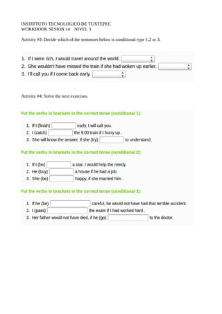 The document is a workbook for session 14 level 3 from the Instituto Tecnologico de Tuxtepec. It contains 5 activities related to conditional sentences and modal verbs. Activity 1 asks students to choose the correct modal verb for 7 sentences. Activity 2 asks students to match numbers with letters to form conditional sentences. Activity 3 asks students to identify whether sentences are conditional type 1, 2, or 3. Activities 4 and 5 contain additional exercises for students to practice conditional sentences and modal verbs.