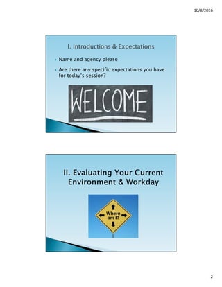 This document summarizes a presentation given by Maureen Salman and John Flynn on taking control of your workday. The presentation covers evaluating your current work environment and time usage through work sampling, identifying welcome and unwelcome interruptions, tips for planning and organizing to be more productive, and the importance of taking breaks. Final thoughts encourage attendees to manage expectations from their boss and take time for themselves despite feeling busy.