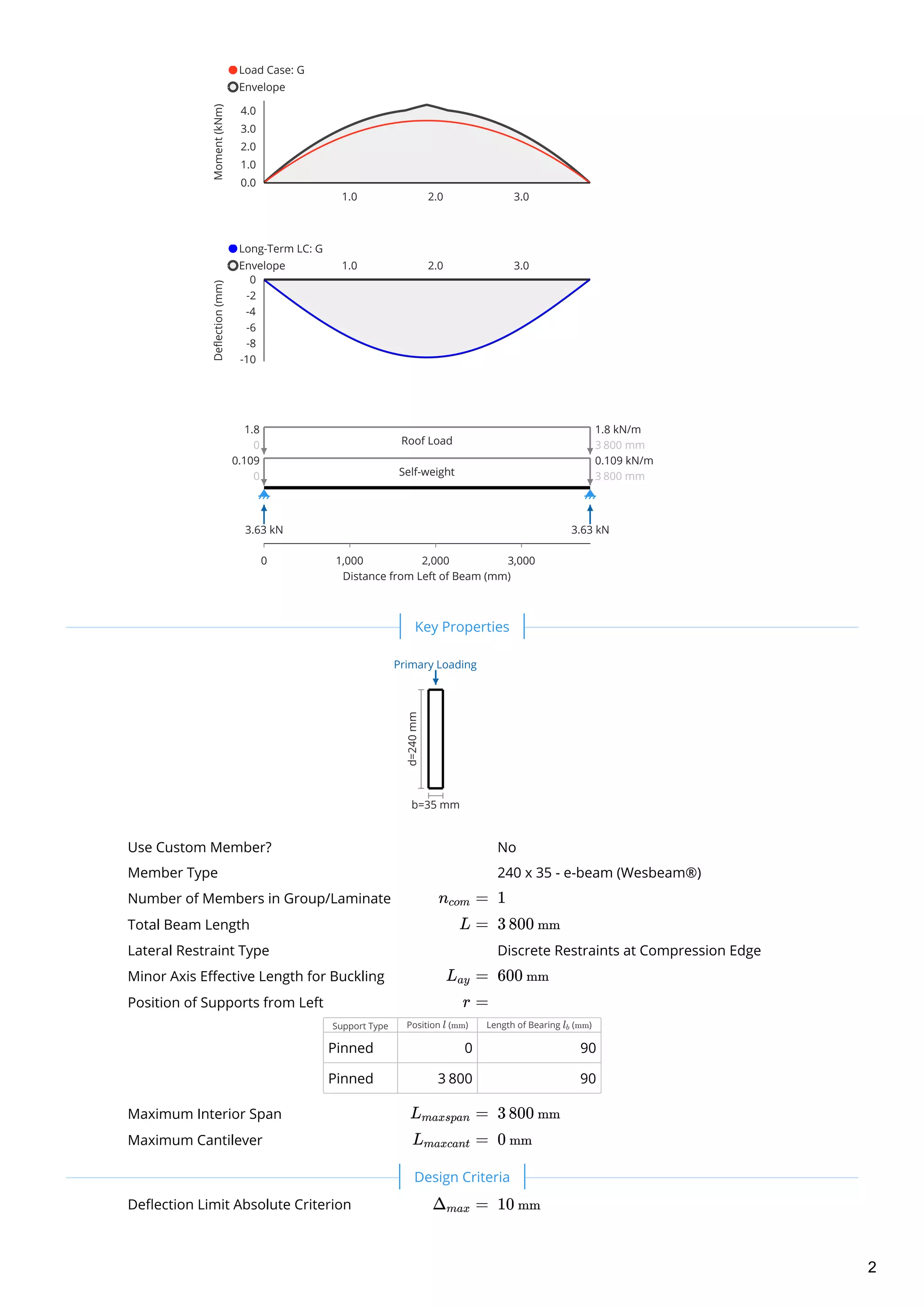 This document analyzes a timber beam used as a floor bearer. It summarizes the demands on the beam from different load cases, including moment, shear, bearing and deflection. The governing load cases are identified as 1.2G, 1.5Q for moment, shear and bearing demands. Short-term deflection is governed by load case G, Q_st, while long-term deflection is governed by G, Q_lt. The beam properties, load cases, demands and capacities are analyzed according to AS1720.1:2010 timber design standard.