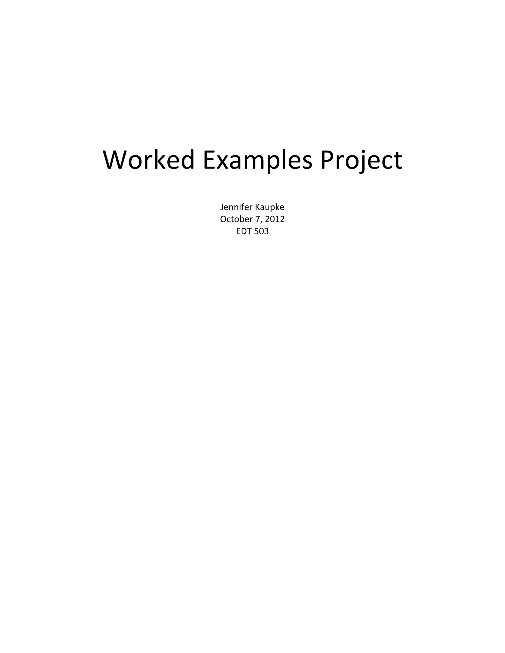 The document provides details about three worked examples that are intended to teach students various math and data skills. Worked Example 1 shows how to add mixed numbers with unlike denominators through step-by-step instructions. Worked Example 2 demonstrates solving basic equations with one variable using addition and subtraction. Worked Example 3 outlines the process for students to create a double bar graph from a provided data table. The examples are intended for students ages 8-13 and aim to address specific learning goals and gaps through interactive instructional modules.