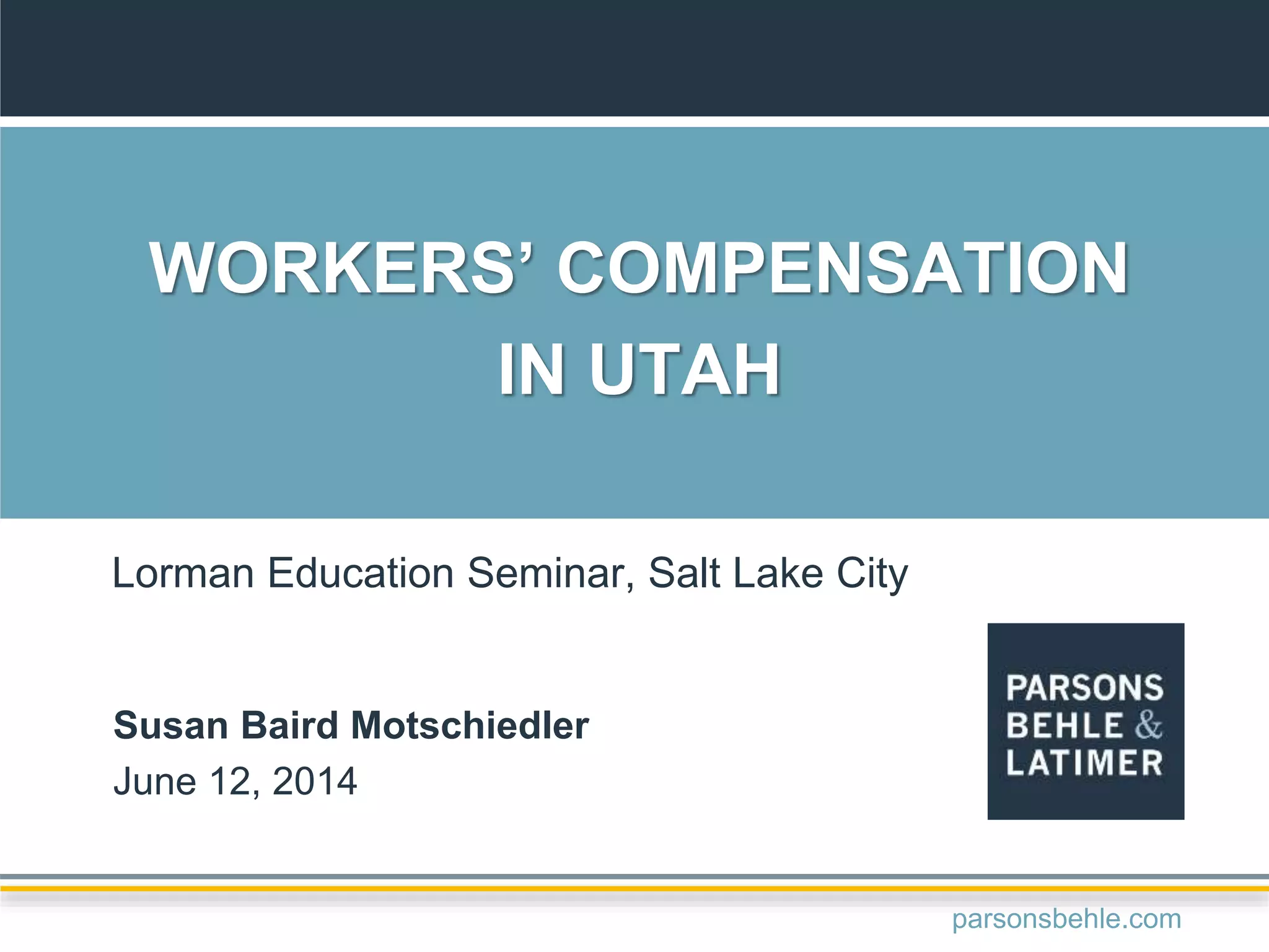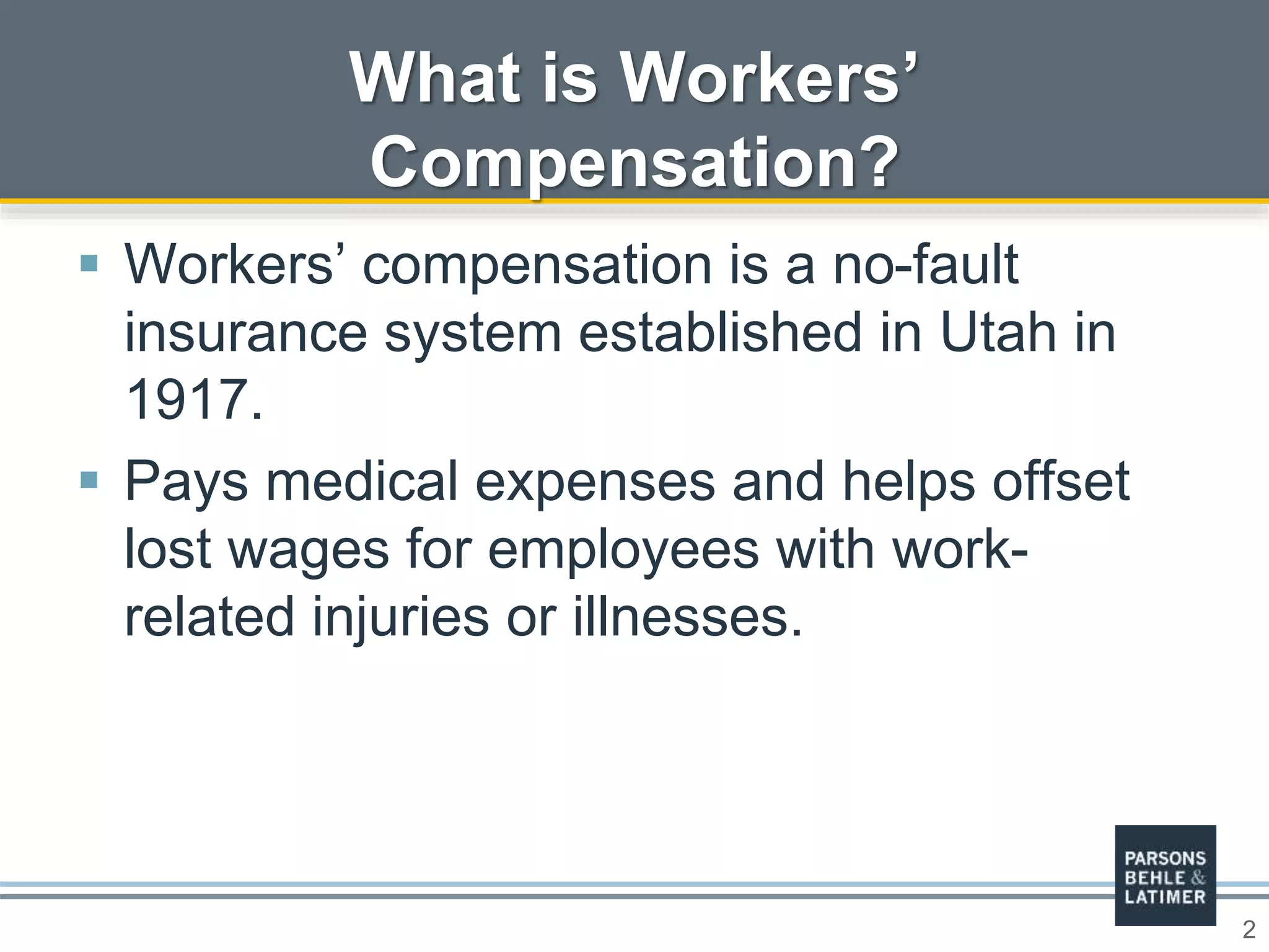 This document provides an overview of Utah's workers' compensation system. It discusses that workers' compensation is a no-fault insurance system that pays medical expenses and lost wages for work-related injuries. It also covers what types of employers and employees are covered, benefits provided, reporting obligations, disputes over fault for injuries, retaliation protections, and return to work processes.