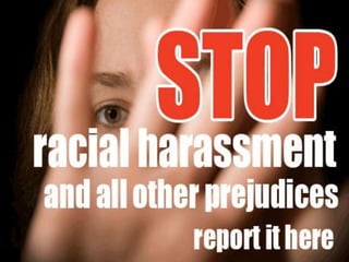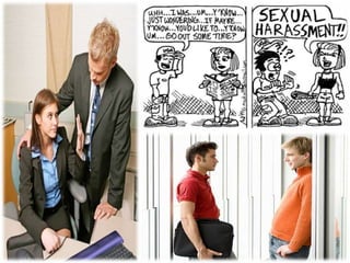 The document discusses various issues around workplace harassment including sexual harassment, racial harassment, workers exploitation through child labor. It provides definitions and examples of different types of harassment, as well as some potential solutions such as strengthening laws against harassment and discrimination.