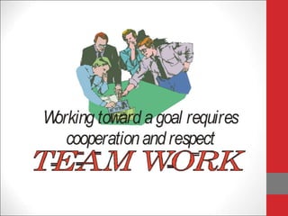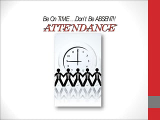 This document discusses work ethic and defines it as a standard of conduct and values for job performance that is morally correct and acceptable to an organization. It then lists the top 10 work ethics as attendance, character, teamwork, appearance, attitude, productivity, organizational skills, communication, cooperation, and respect. Each work ethic is further explained, with attendance discussing limiting absences and being on time, and character discussing being dependable, loyal, and having leadership abilities. The document emphasizes presenting a good attitude, communicating well, working hard, and showing respect.