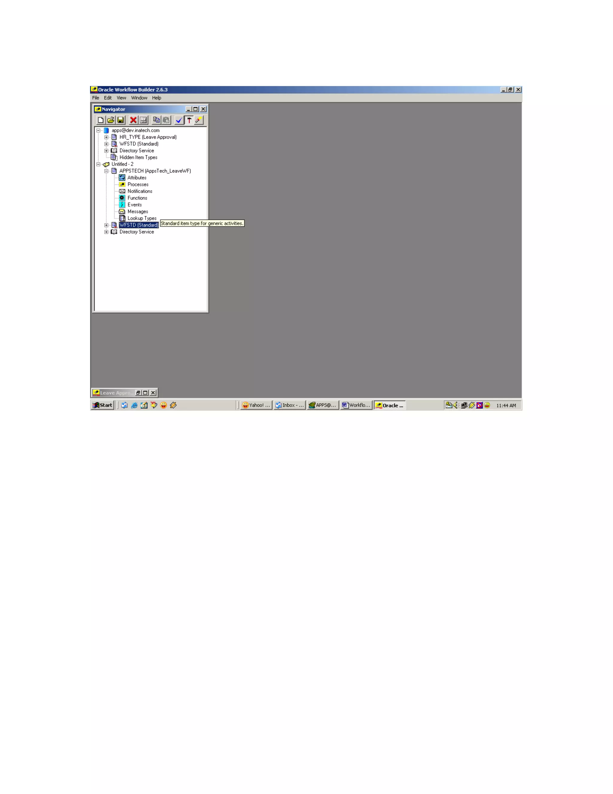 The document discusses Oracle Workflow Builder and its components. Oracle Workflow Builder is a graphical tool for creating and modifying workflow process definitions. It contains a Navigator window to add activities and components, and a Process window to assemble them into a workflow diagram. Key components of a workflow include processes, activities, and attributes. Processes represent business flows and can contain activities like notifications or functions. Attributes represent input/output parameters of activities.