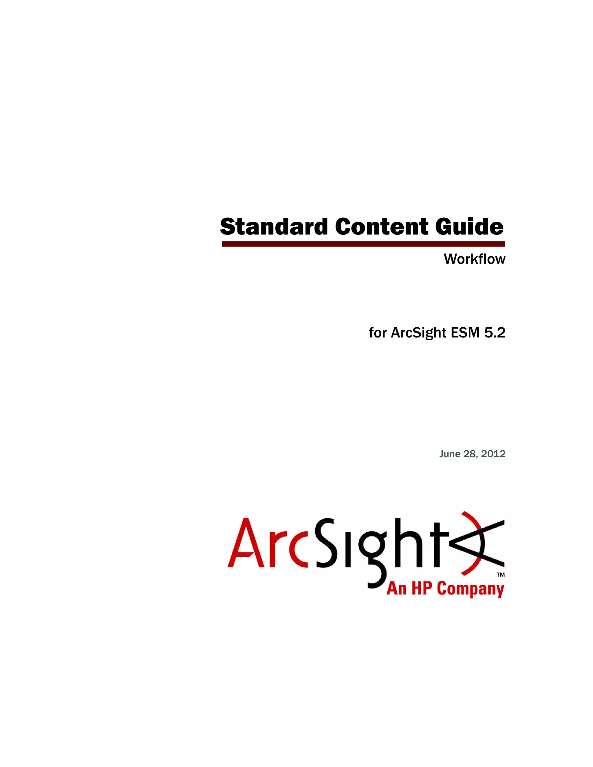 The document discusses installing and configuring the standard content Workflow package in ArcSight ESM. It describes installing the Workflow package, configuring the network model and asset categories, enabling relevant rules, ensuring filters capture necessary events, configuring notification destinations and cases, scheduling reports, and configuring trends. The goal of these configuration steps is to activate the Workflow content and customize it for the user's environment.