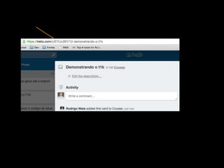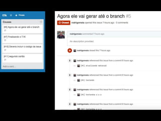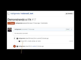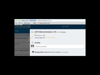 The document describes a workflow and Ruby gem called T1k that is used to link Trello cards to GitHub issues and code commits. It allows creating an issue from a Trello card, updating the card with the issue ID, checking out a branch with the issue ID, committing code with a reference to the issue, syncing the branch with master, and pushing the code. The T1k gem handles the interactions with Trello and GitHub APIs to enable this workflow.