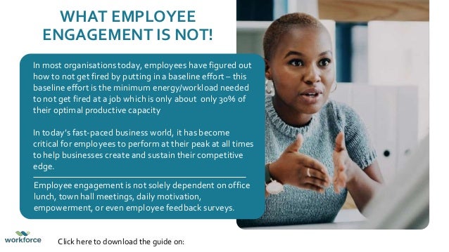 The document discusses strategies for improving employee engagement, emphasizing that true engagement goes beyond basic compliance and requires emotional commitment and motivation. Engaged employees demonstrate initiative, cooperation, and a strong connection to their organization, while disengaged employees lack passion and may actively undermine their work environment. Key factors for engagement include feeling valued, having opportunities for growth, and the influence of leadership on motivation and workplace culture.