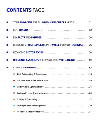 This document provides an overview of The Workforce Solution's human resources management services. It offers staff outsourcing, recruitment, temporary and permanent staffing solutions to over 3,400 clients across all sectors of the South African economy. The Workforce Solution prides itself on its expertise, national infrastructure of over 150 branches, database of over 250,000 candidates, and ability to fill staffing needs quickly. It aims to create jobs and develop skills while ensuring full compliance with South African labor laws and regulations.