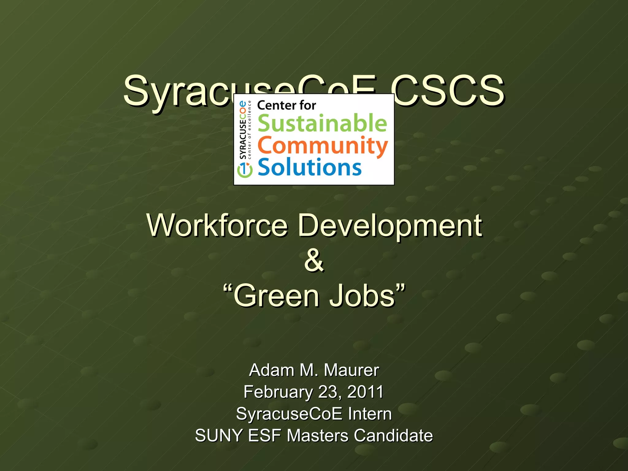 The document discusses workforce development and the potential for 'green jobs' in Syracuse, particularly through the process of deconstruction as an alternative to demolition. It highlights barriers to implementation, the state of vacant homes, and the economic and ecological benefits of pursuing deconstruction initiatives. Additionally, it emphasizes the need for enhanced infrastructure and workforce training to foster growth in the deconstruction industry in Central New York.