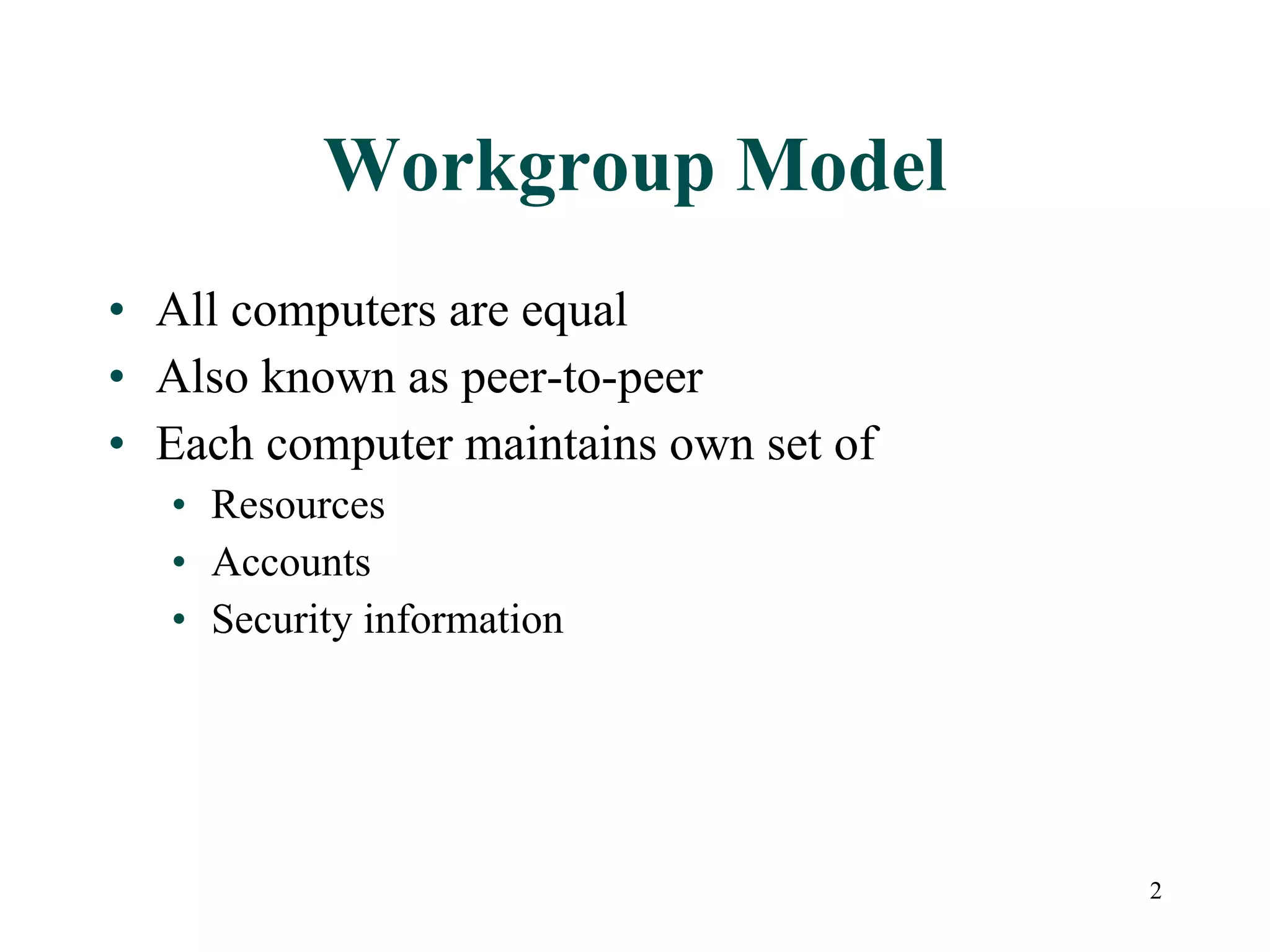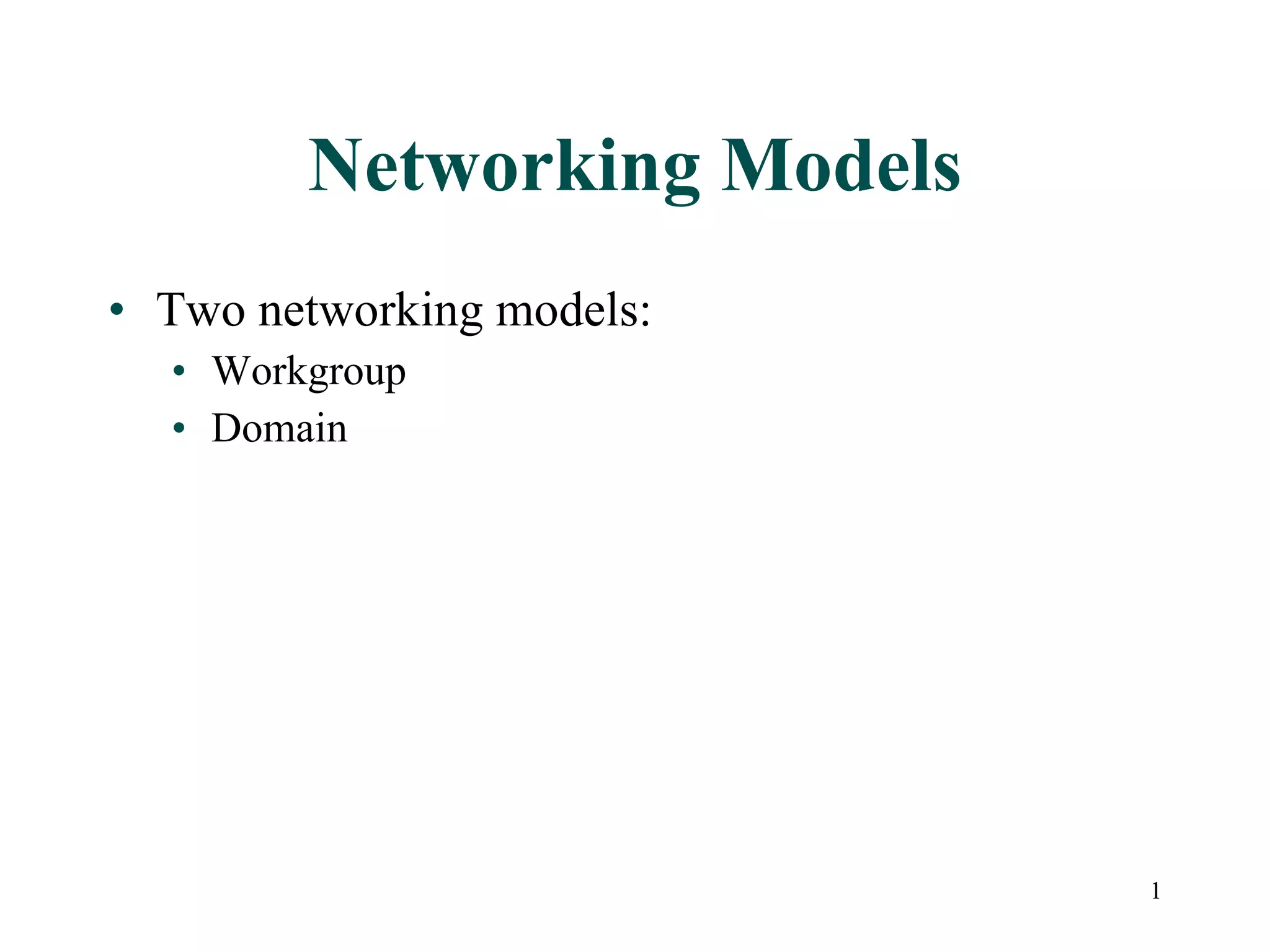There are two networking models: the workgroup model where all computers are equal peers and each maintains its own resources, accounts, and security information; and the domain model which centralizes shared resources and administration/security through at least one domain controller for simpler centralized management.