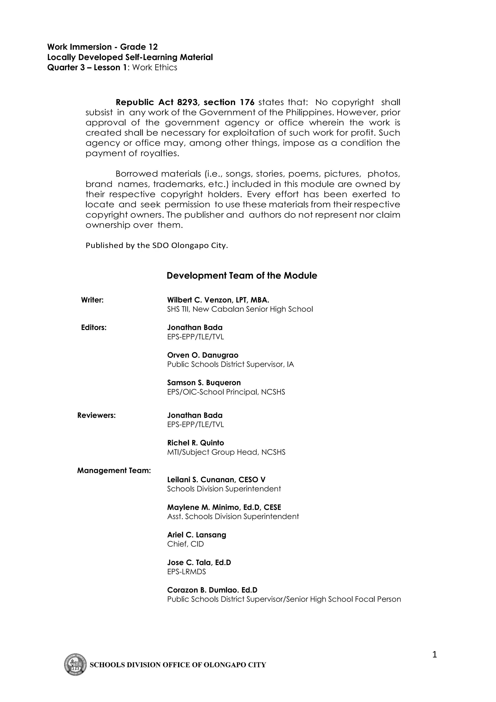 This document provides an overview of work ethics for students. It defines work ethics as standards of conduct and values for job performance. Key characteristics of good work ethics discussed include attendance, productivity, character, organizational skills, teamwork, communication, appearance, cooperation, attitude, and respect. The document includes activities for students to identify right and wrong behaviors at work and how they would handle various ethical situations. It also lists specific actions to maintain good attendance.