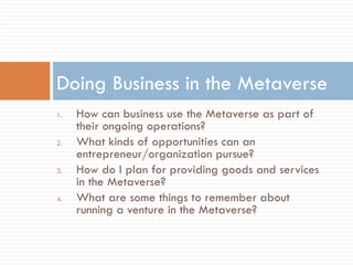 The document discusses how businesses can operate in the metaverse and provides guidance on planning a venture in virtual worlds. It outlines general categories of goals for an organizational entry into the metaverse like exploration, improving effectiveness, and generating revenue. It also covers identifying the target market and audience, choosing a platform, developing a marketing plan, and managing the implementation and community to support a successful virtual world presence.