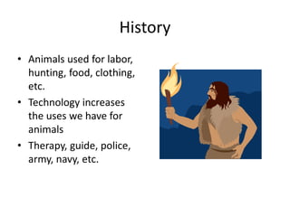 This document discusses the history and various uses of working animals. It covers how animals are used for therapy, as service animals, and in jobs like the military, police, and search and rescue. Therapy animals can be dogs, horses, or dolphins and are used in hospitals and schools to aid in physical, mental, and emotional recovery. Service animals help those with disabilities and are highly trained to assist with tasks. Working animals also have roles in the police, armed forces, and for search and rescue operations where they help with detection, rescue, and delivery of messages.